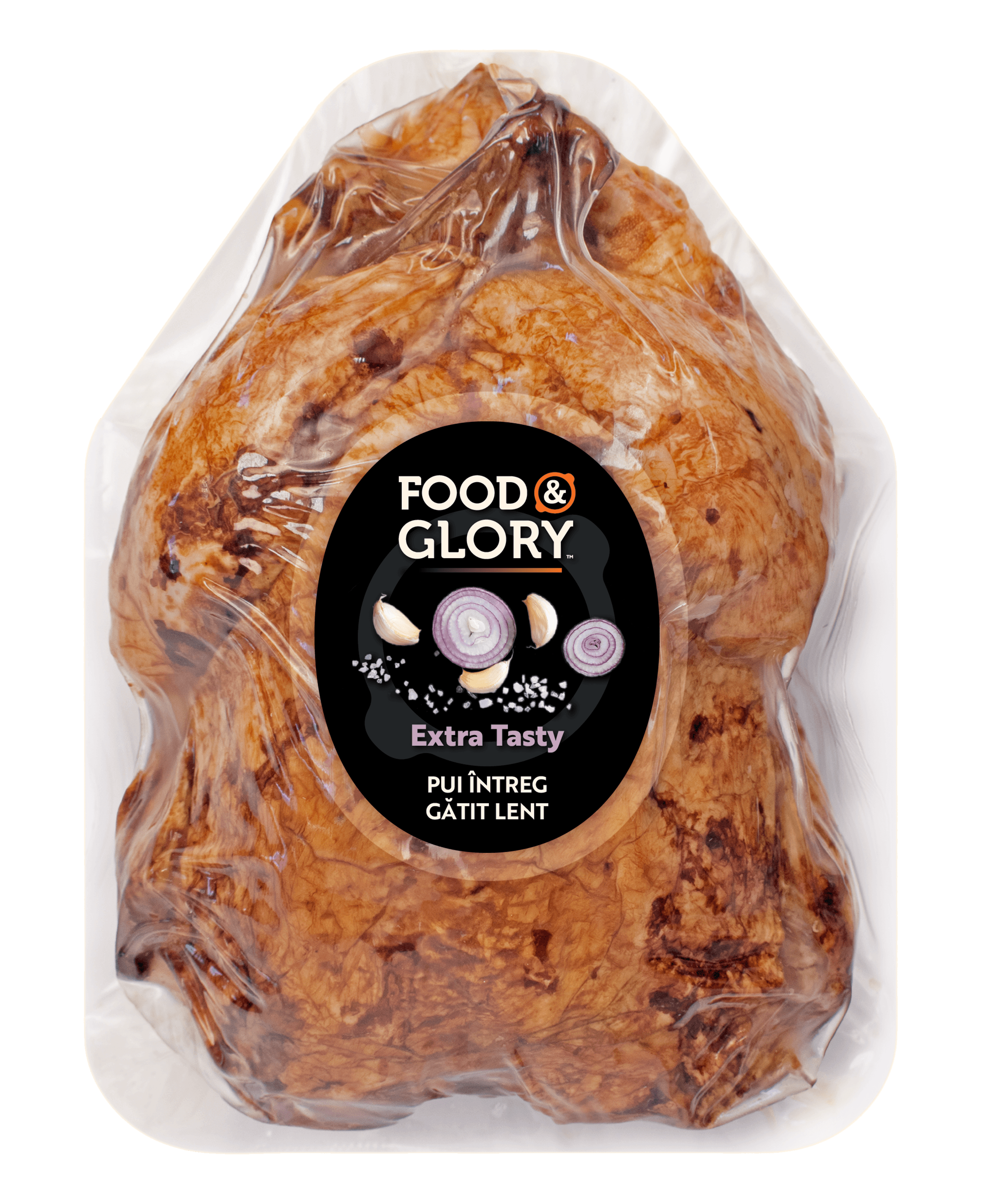 Pui întreg eviscerat 96%, sare, arome, dextroză, usturoi, ceapă, extract de drojdie. Produsul poate conține urme de MUȘTAR, SOIA.