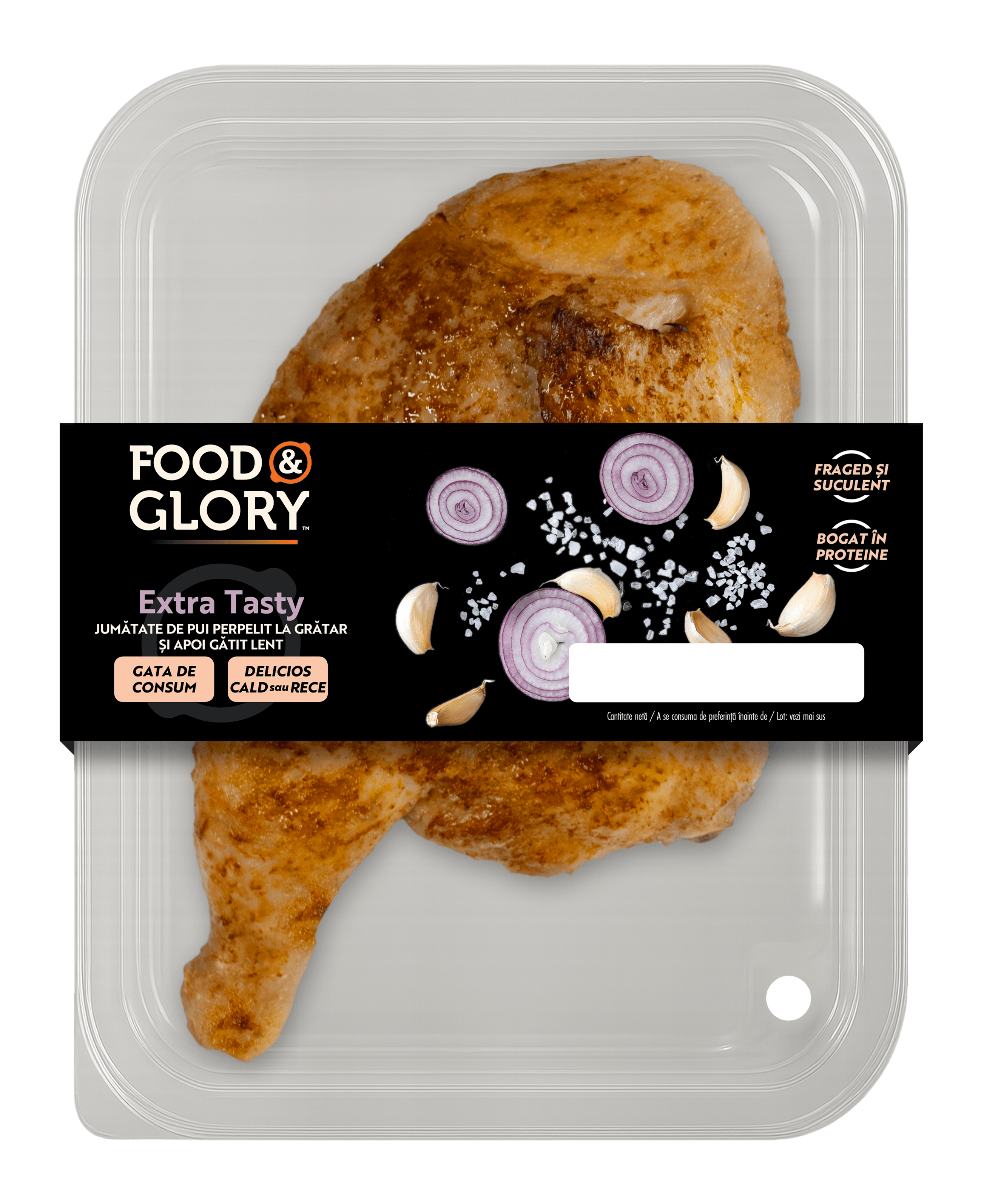 jumătate de pui eviscerat 96%, sare, arome, dextroză, usturoi, ceapă, extract de drojdie. Produsul poate conține urme de MUȘTAR, SOIA.