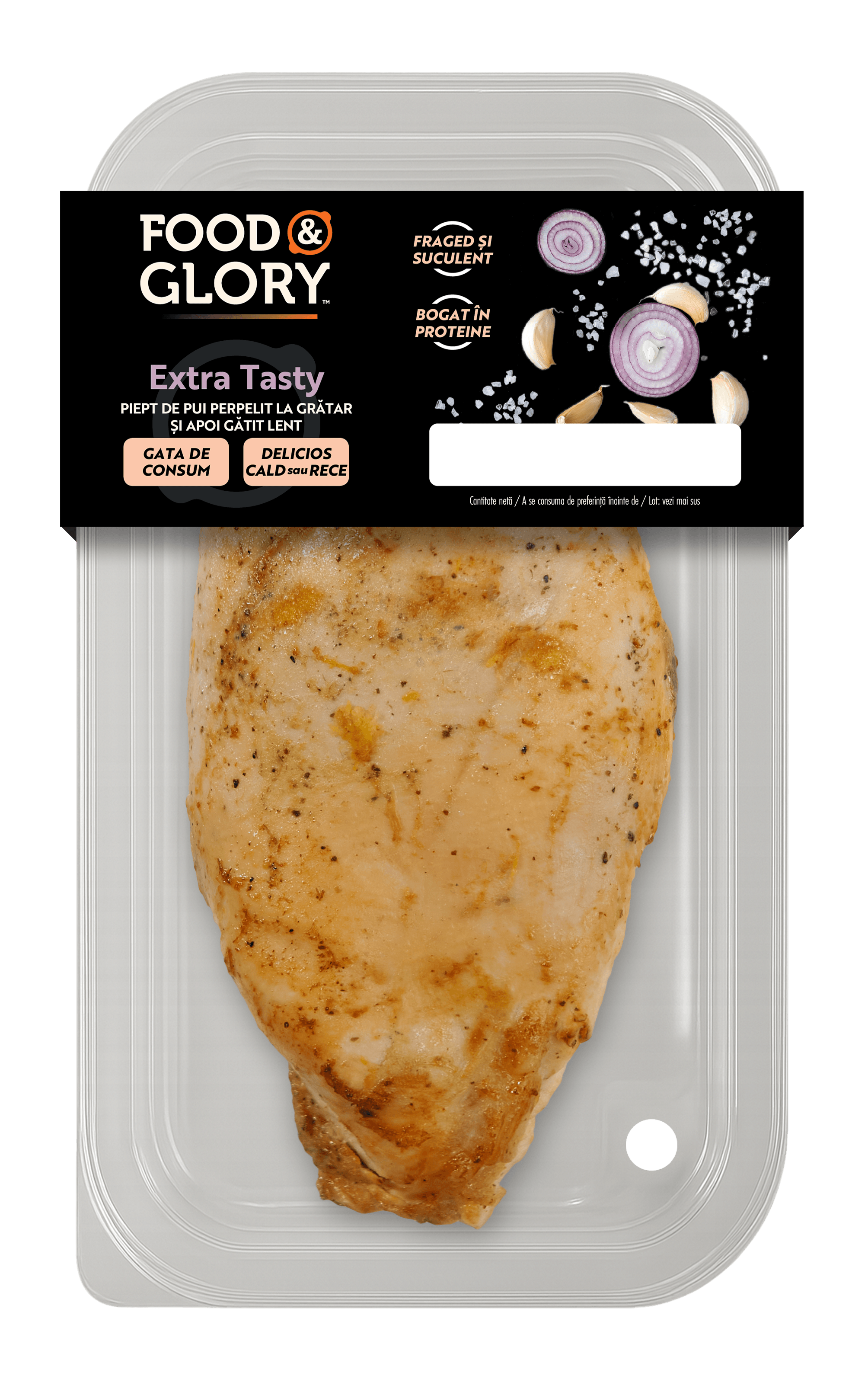 piept de pui dezosat fără piele 98%, sare, arome, dextroză, usturoi, ceapă, extract de drojdie. Produsul poate conține urme de MUȘTAR, SOIA.