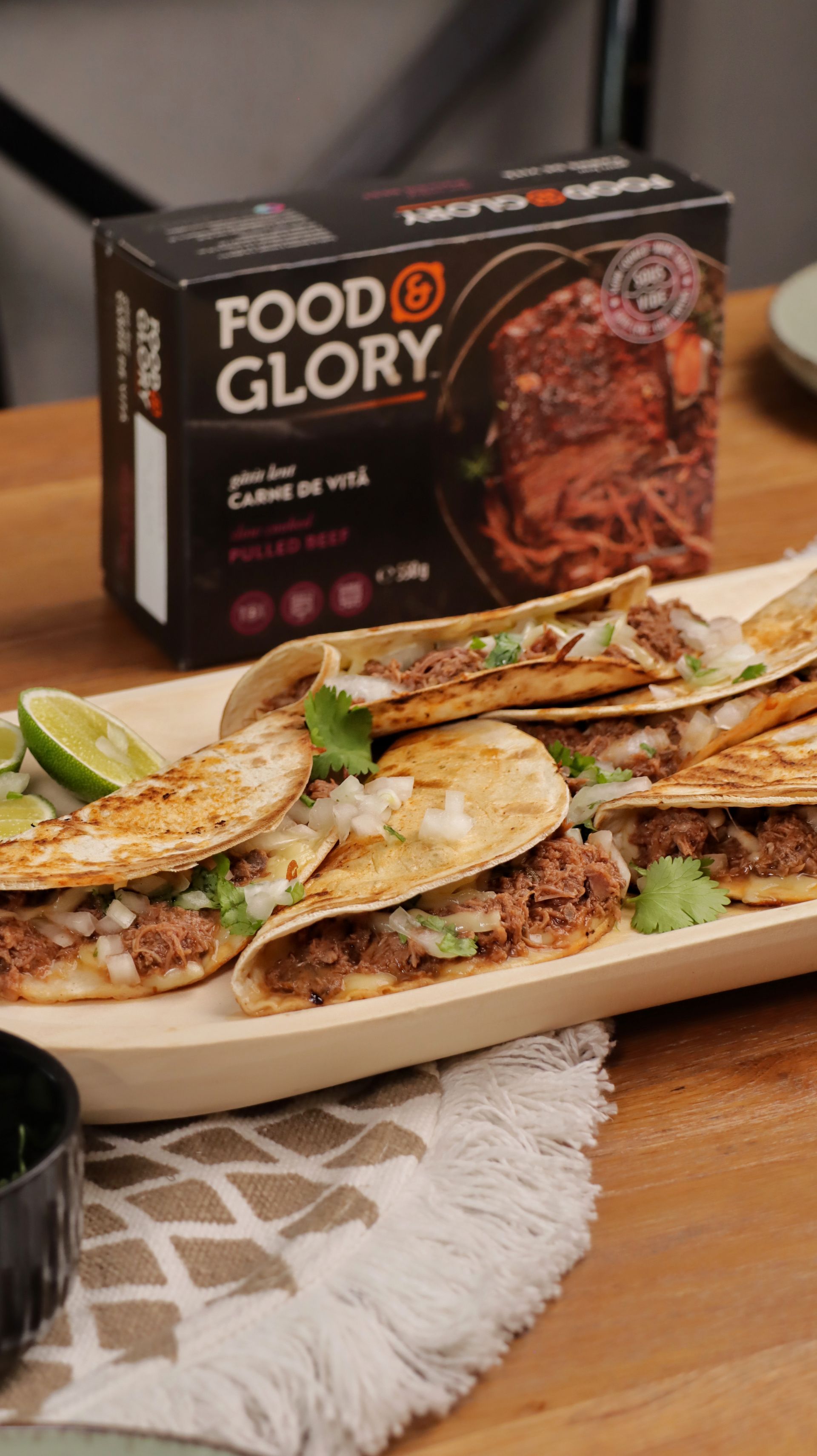 Încălzește tortillas în tigaie: unge-le pe o parte cu sosul păstrat, rumenește-le mai întâi pe partea uscată, întoarce-le și adaugă mozzarella rasă, pulled beef, ceapă marinată, coriandru și extra mozzarella. Împăturește tortilla și lasă pe foc până când brânza se topește.